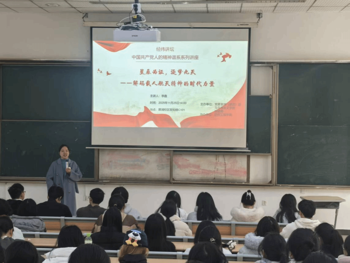 为深入学习中国共产党人的精神谱系,传承和弘扬载人航天精神,引导青年学子汲取奋进力量,11月25日由党委宣传(统战)部、马克思主义学院和校团委联合主办,纺织工程学院协办的“经纬讲坛—中国共产党人的精神谱系系列讲座”第七期专题讲座在我校致知楼C101成功举行。马克思主义学院李鑫老师以“星辰为证,逐梦九天——解码载人航天精神的时代力量”为主题进行讲授。纺织工程学院近200名同学到场聆听讲座。