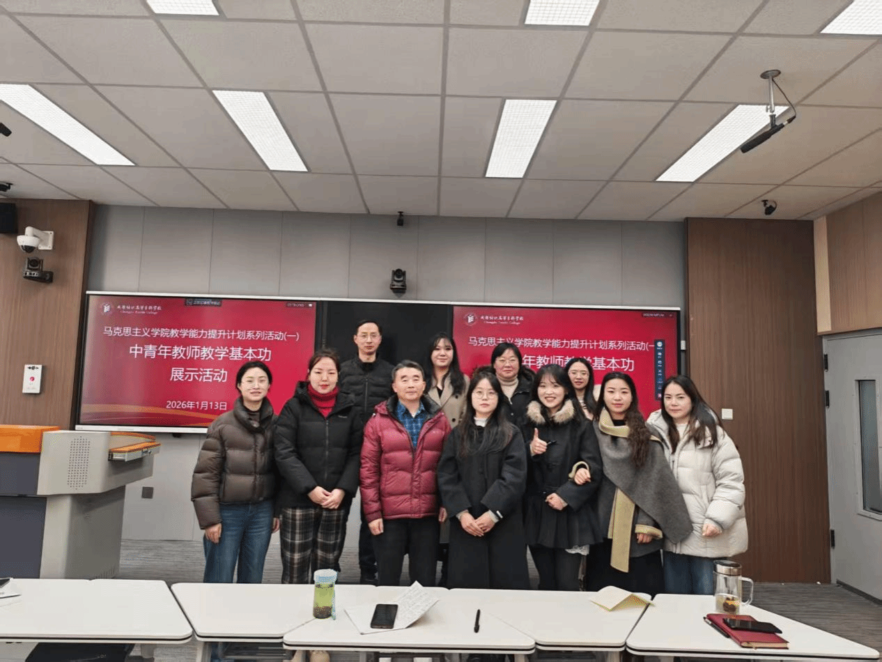 初赛阶段于2025年12月16日、23日两天在致知楼A102教室分两场进行。学院“习近平新时代中国特色社会主义思想概论”、“毛泽东思想和中国特色社会主义理论体系概论”、“形势与政策”以及“思想道德与法治”四个教研室的中青年教师全员参与,围绕指定主题进行教学片段展示。教师们教学设计用心、讲授各具特色,充分展现了扎实的理论功底和积极的教学风貌。经评审,各教研室择优推荐两名教师,共八位教师成功晋级决赛。